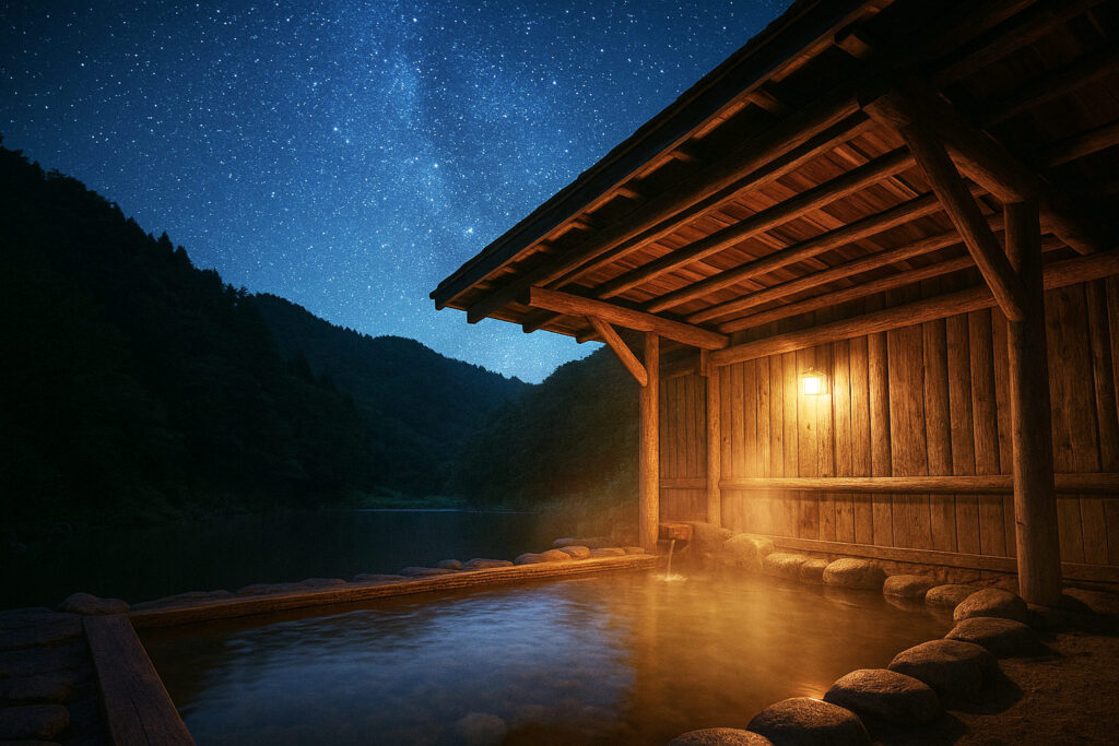 微硫黄泉特有のやさしい香りと、やや高めの湯温 (42℃前後) が特徴で、冷え性や筋肉疲労の回復に効果的。露天風呂からは湖面に映る山並みや紅葉を「水鏡」のように眺められ、静寂と湯気が織りなす幻想的な景観が魅力です。浴場内の休憩スペースからも湖畔の風景を一望でき、ゆったりとくつろげます。夕暮れ時には照明に照らされた水面がきらめき、夜間は満天の星空を眺めながら入浴が可能です。